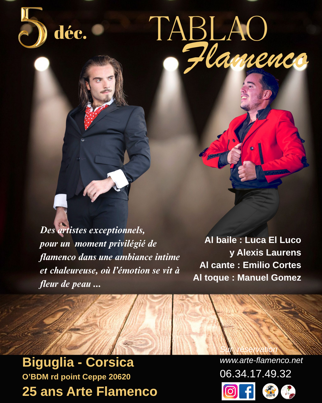Un bel anniversaire, ARTE FLAMENCO fête ses 25 ans ! Un quart de siècle déjà ... Depuis 25 ans, ARTE FLAMENCO fait vibrer la Corse au rythme du duende et de la passion andalouse. Toujours animés par un même élan, nous continuons à partager, transmettre et célébrer l'art flamenco sous toutes ses formes. A l'occasion de cet anniversaire, une belle surprise attend nos adhérents et nos amis. Ce sera le 5 décembre, une date à retenir. Nous proposons deux entrées, à choisir au moment de votre réservation.