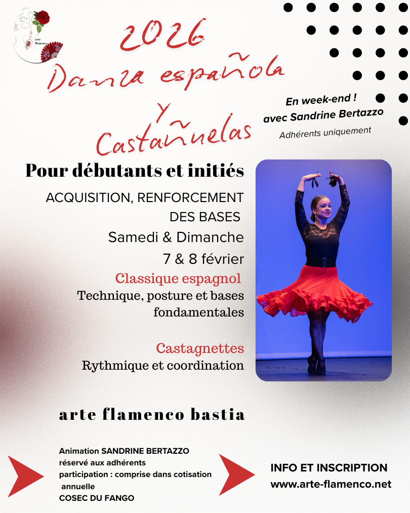 Samedi 7 février COSEC DU FANGO de 16:00 à 18:45 : 1H de castagnettes et 2h de classique espagnol