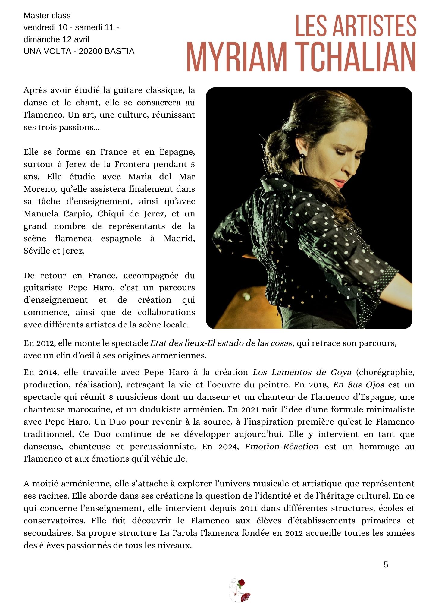 Riche, piquante, séduisante ... la 5ème édition du Scontru Flamenco, s'annonce inoubliable ! DEMANDE D'INFORMATION COMPLEMENTAIRE Cette 5ème édition du SCONTRU FLAMENCO, propose une initiation au flamenco pour les adultes, ainsi que des ateliers de perfectionnement autour de la danse flamenco, la découverte du compas flamenco et du chant corse. De même en partenariat avec UNA VOLTA, nous proposons un stage pour enfants, 6 - 9 ans le lundi 13 avril. Info |